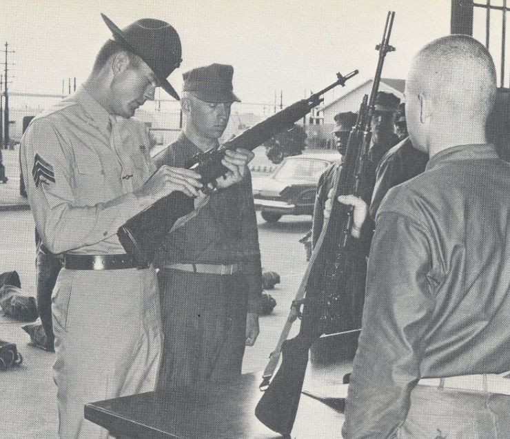 Once we completed the tests – after a couple hours I am guessing, we were marched to another large, long, one-story wooden building. We lined up single file. One by one we were issued our rifle – an M-14. This would be our weapon throughout training. The first thing I noticed when I was handed my weapon – it was greasy.