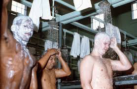 We stripped naked and got into the gang shower. Reminded me of post swim practice in high school and college only with a frantic urgency. We stood naked at attention. All the shower heads came on at once. Cold water. Remember this is January. The recruits yelled.